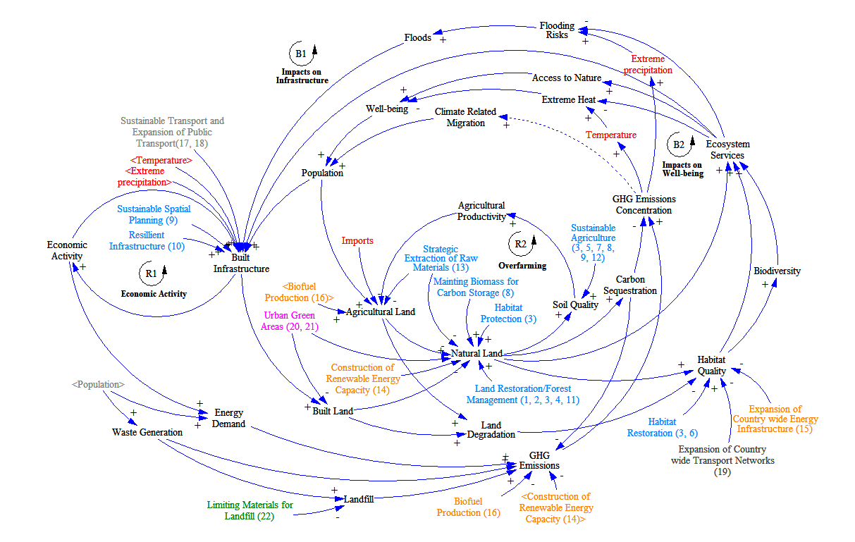Top-down policies from the EU can help in preserving natural capital, with examples including the protection of habitats, promotion of sustainable agriculture, and support for land restoration. Linking back to the CLD in Figure 2, these strategies would limit the strength of R2, by boosting natural land which in turn would reduce negative impacts on population and infrastructure (B1 and B2).