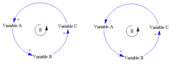 System maps detail the connection between variables in a system, using arrows that denote the influence one has on the other. For example, if an increase in Variable A leads to an increase in Variable B, this indicates a direct causality that is represented with the sign “+”. The use of a “-” sign, on the other hand, implies that a change in variable A would result in an opposite change in variable B. If these variables link together to form a circle, that circle represents a feedback loop. If an initial increase in A leads to a further increase in A after completing the loop, this signifies a self-reinforcing feedback loop (R). Conversely, if an increase in A results in an eventual decrease after following the loop, this is called a balancing feedback loop (B).